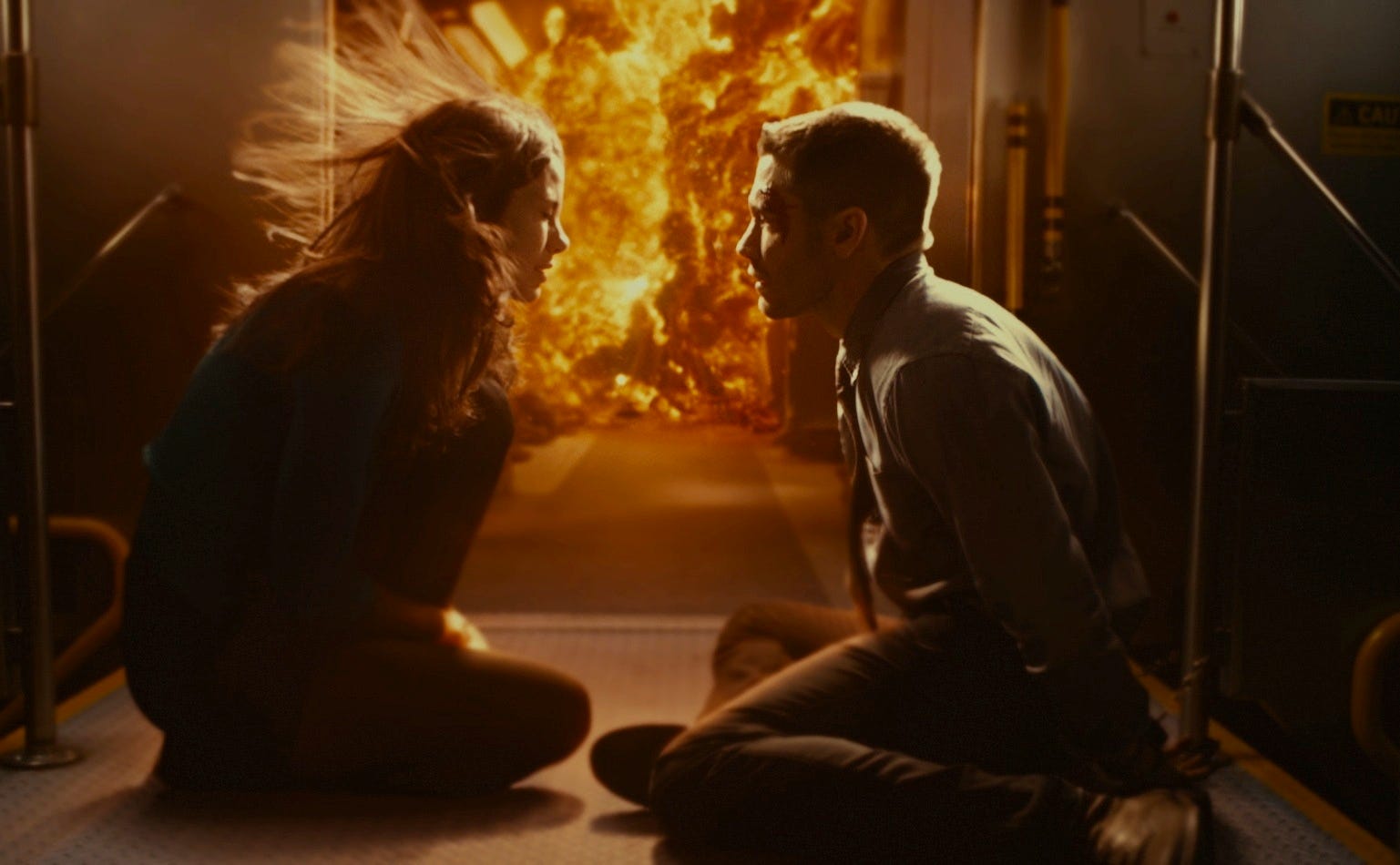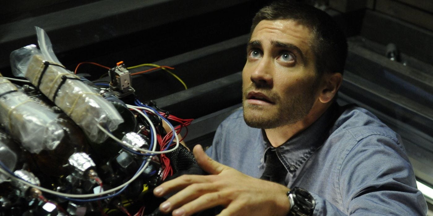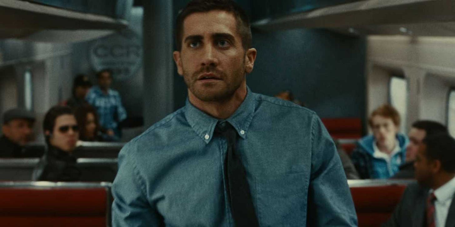 Jake Gyllenhaal’s Colter Stevens, a U.S. Army pilot, wakes up in the body of a random person on a train headed to Chicago and he discovers the hard way that there’s a bomb riding the train, too. When it goes off and he’s killed, Stevens wakes up in a capsule and learns he’s been recruited for a secret government pseudo-time travel parallel universe simulation thing in which he must discover the identity of the bomber and, because of a bunch of brain science jargon, he only has eight minutes to do it. Stevens repeats the event over and over again not to prevent the train bomb, but to ID the bomber to stop the future detonation of an even bigger bomb. Source Code takes a lot of influence from its predecessors in the genre. It would be easy to simply label it as Groundhog Day (1993) on a train, but I see it as an amalgamation of Groundhog Day (1993) and Twelve Monkeys (1995) with a little bit of Déjà Vu (2006) thrown in for good measure.
