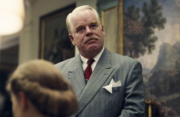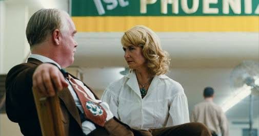 Philip Seymour Hoffman is brilliant in his portrayal of Lancaster Dodd as a grade A bullshit artist. He’s quick-thinking, learned, and a master manipulator, but a discerning eye free of Kool-Aid-colored glasses can see through it. The aforementioned skeptic calmly tries to discuss the holes in Dodd’s ethos and when the Master can’t master the debate he lashes out, loudly calling the man a “pig fucker” in a room of snooty New York socialites. In this moment, the viewer sees the one trait he and Freddie share and the secret to their bond: a quick temper triggered by insecurity. He has another flash of anger when a devoted disciple, Laura Dern’s Helen, points out an inconsistency in the processing—uh—process laid out in Dodd’s second book; after unsuccessfully trying to bullshit his way out of the situation, he finally yells and causes her to jump in her seat.